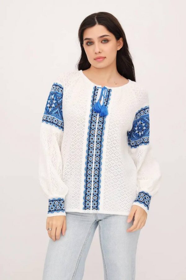 В’язана жіноча вишиванка Газдиня (біло-синя)