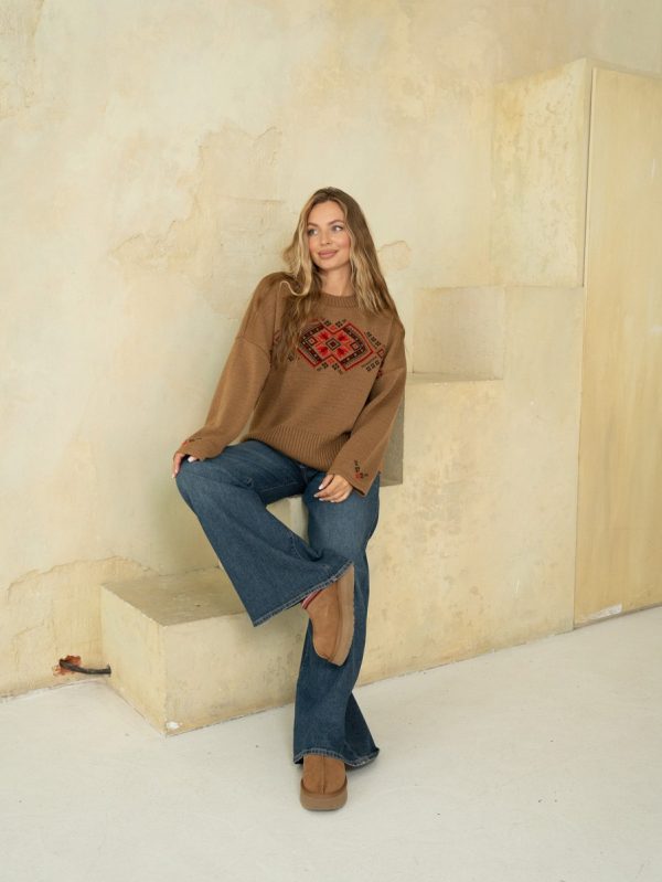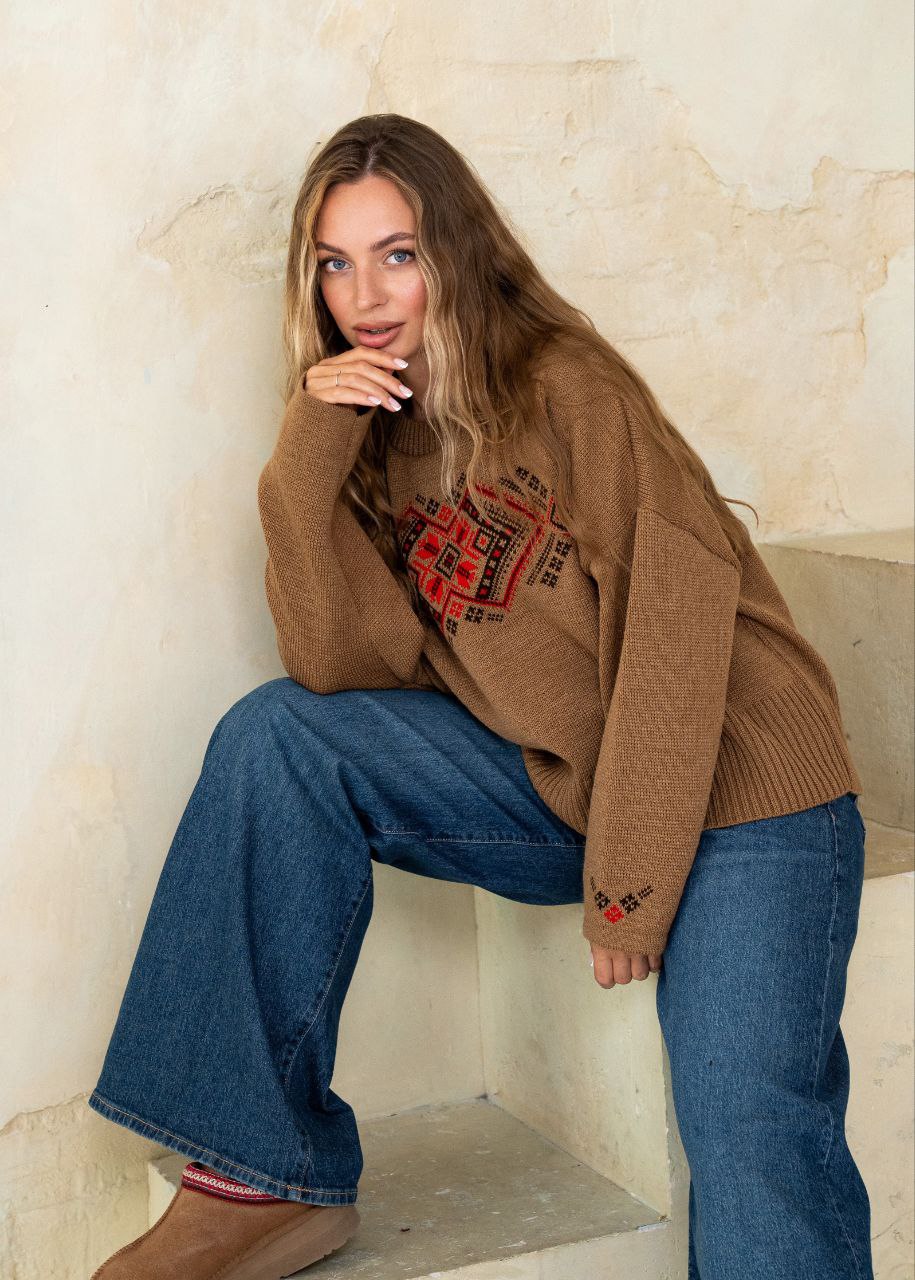 Джемпер Мрія (коричневий з червоним) в етно -стилі дуже теплий та комфортний.