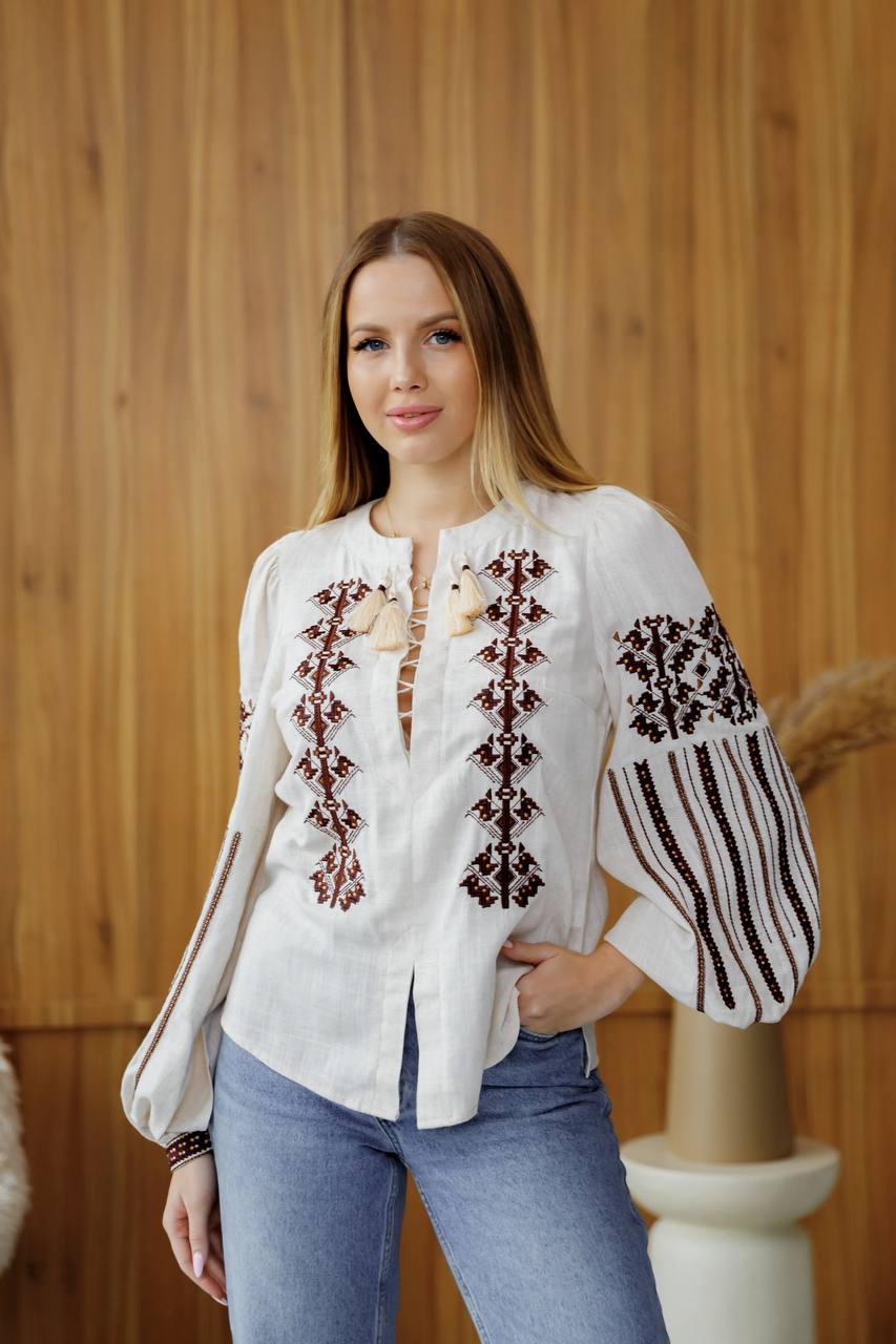 Жіноча вишиванка Залісся (беж-меланж) виконана на натуральній тканині.