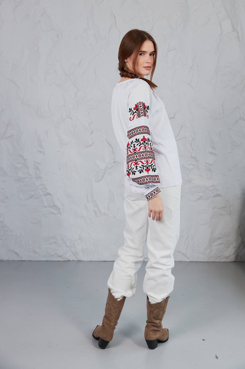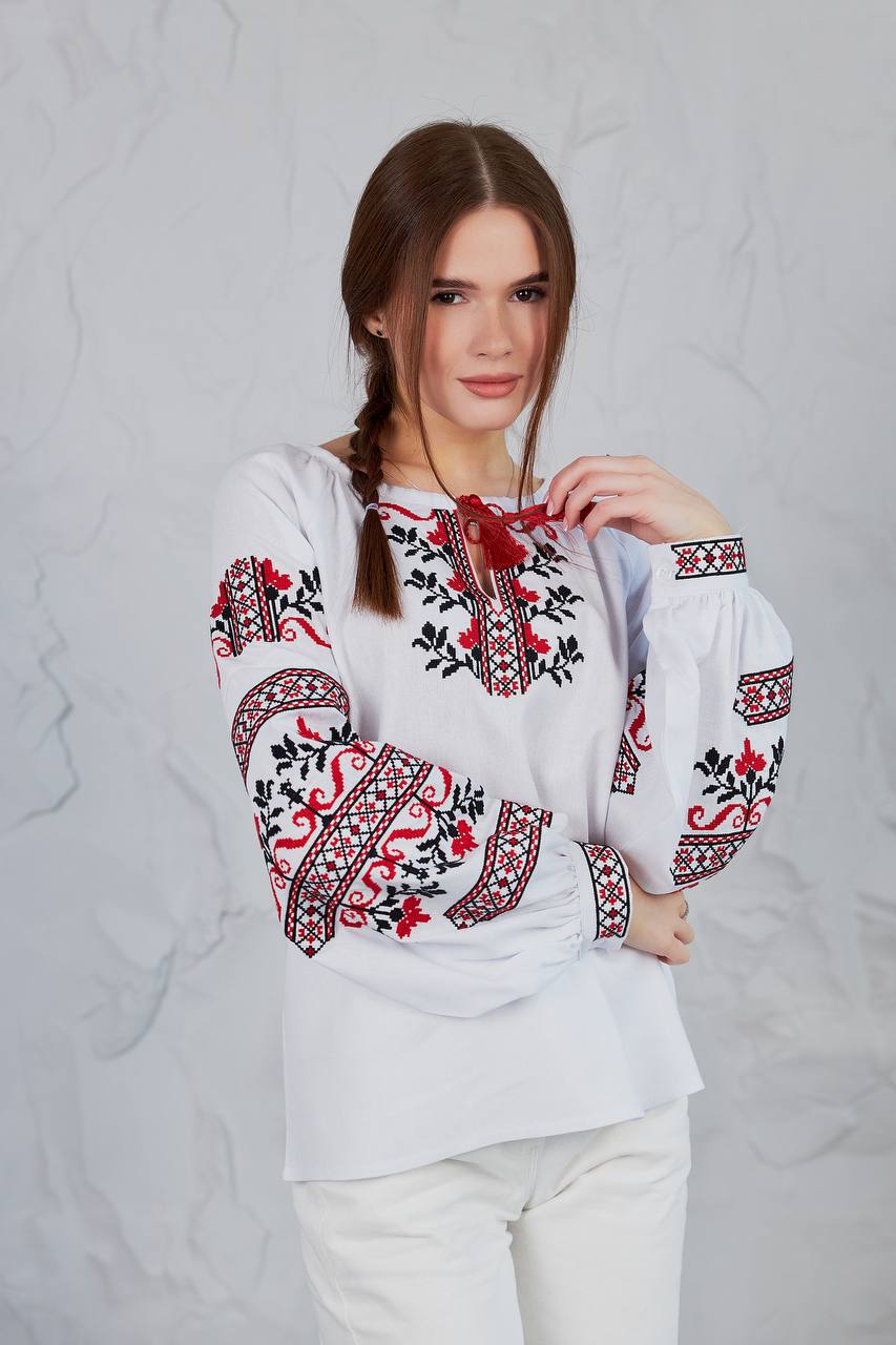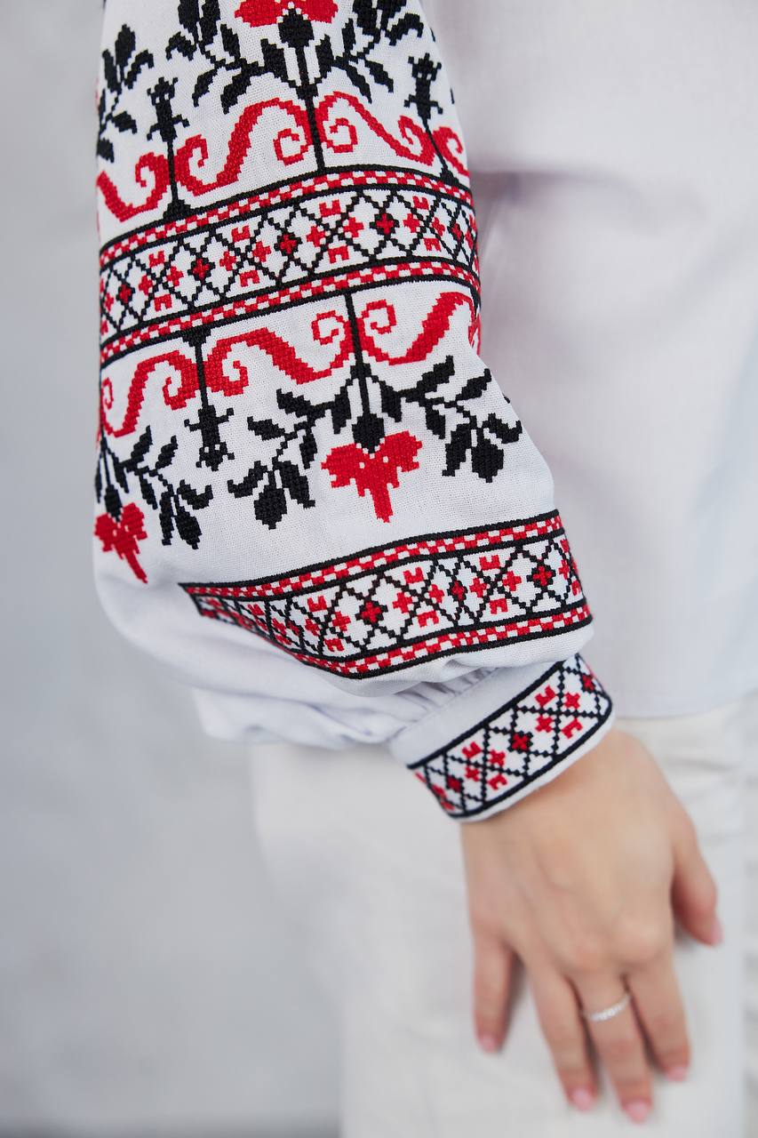 Жіноча вишиванка Стожари (біла) виконана на натуральній тканині.