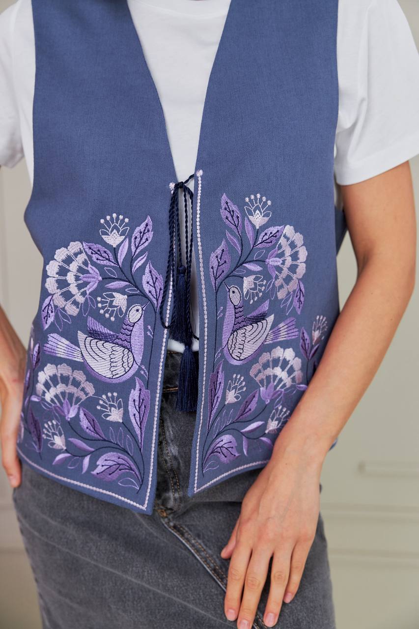 Жіноча вишита жилетка Дивоцвіт (сіро-фіолетова) виконана на льоні.