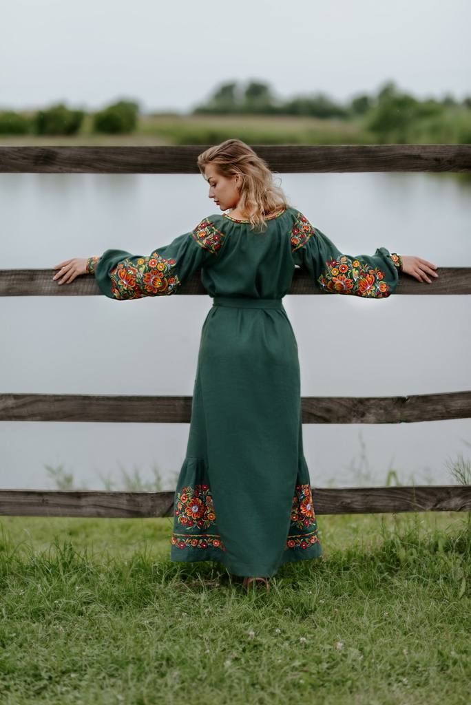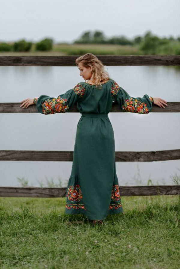 Жіноча вишита сукня Петриківка (смарагдова) виконана на льоні