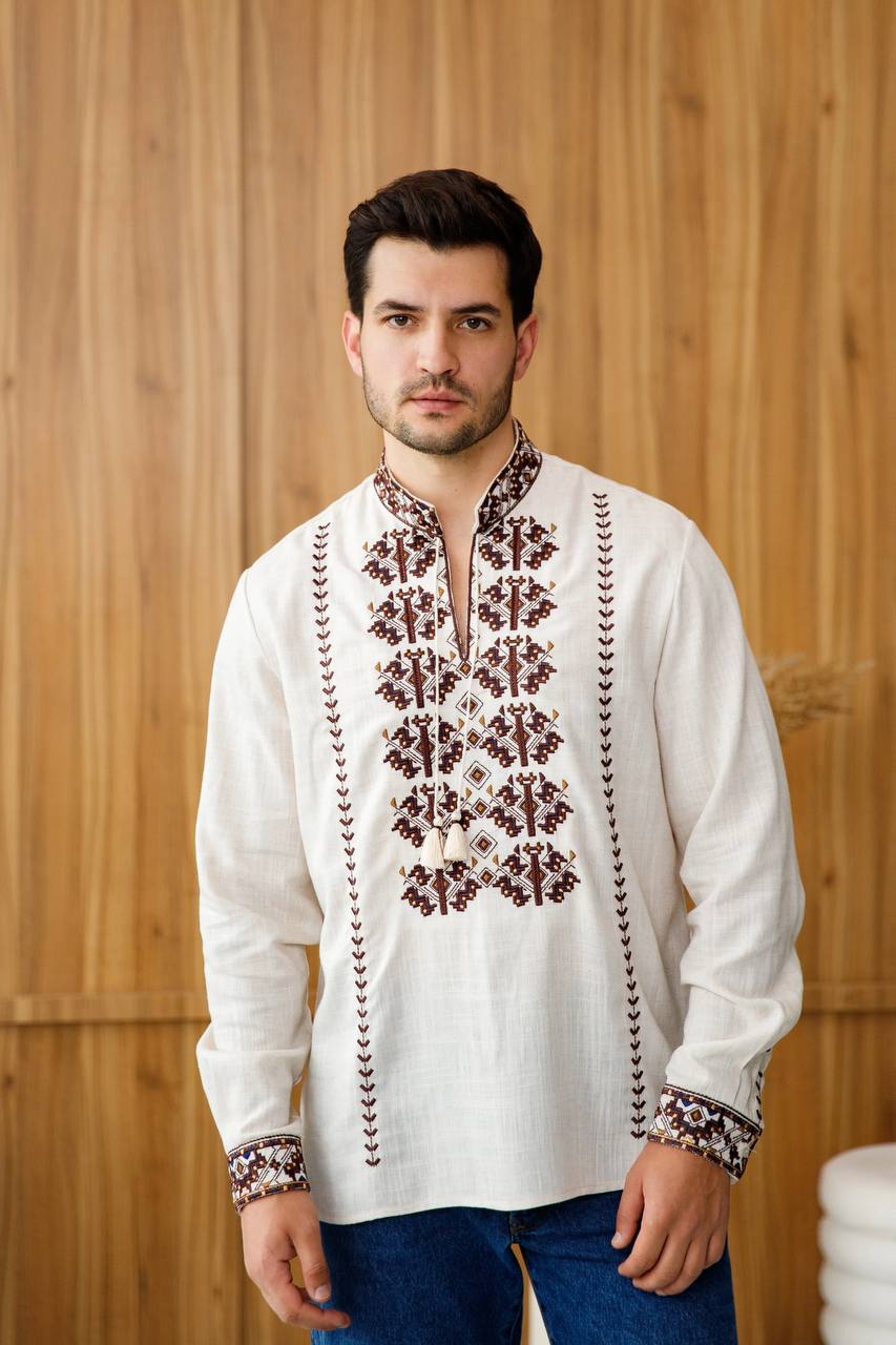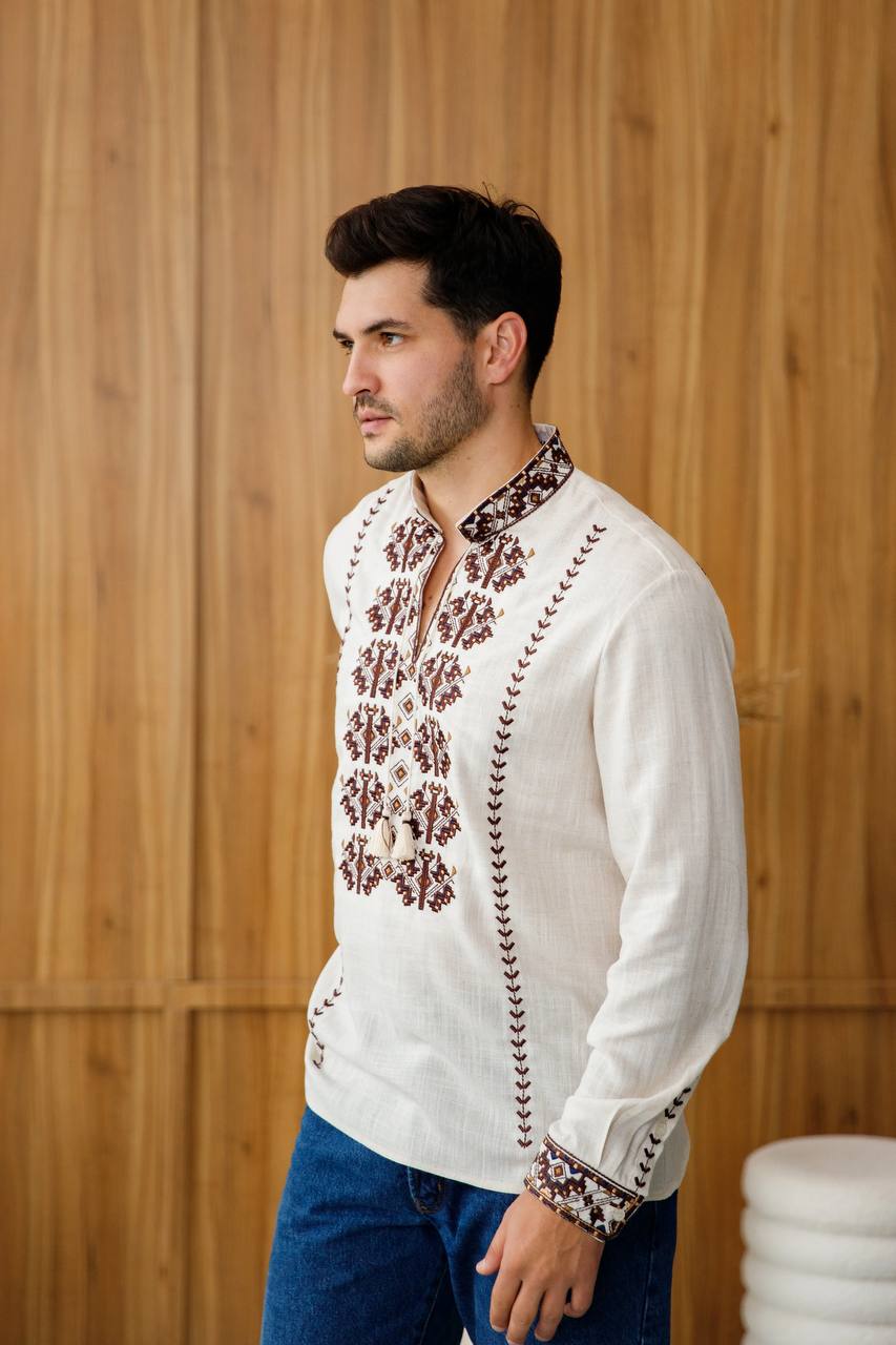 Чоловіча вишиванка Залісся (беж-меланж) виконана на натуральній тканині .
