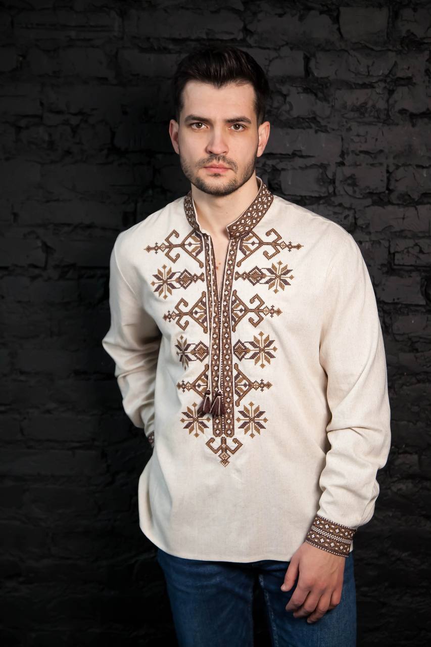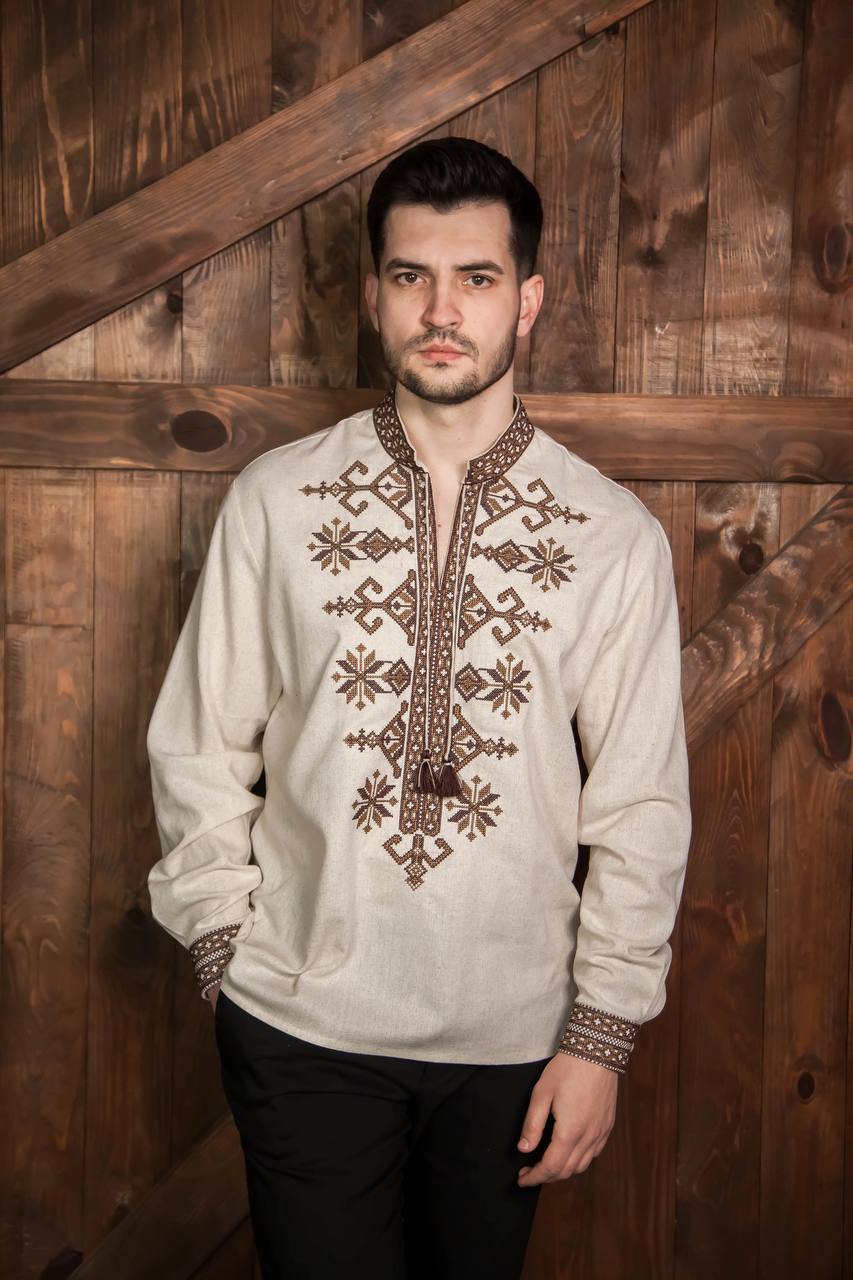 Чоловіча вишиванка Козацька (меланж-коричнева) виконана на натуральній тканині.