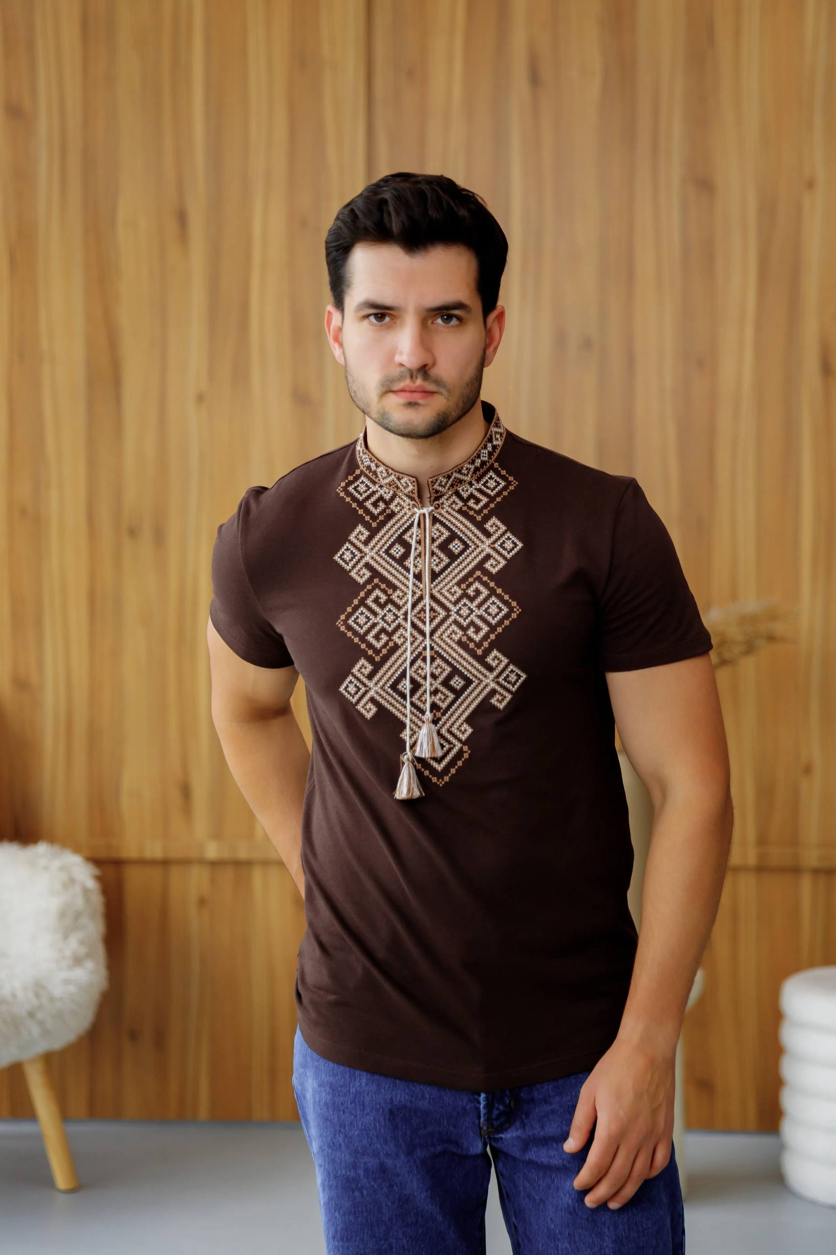 Чоловіча вишита футболка Остап ( шоколадна) виконана на трикотажі. Тип вишивки- хрестик.