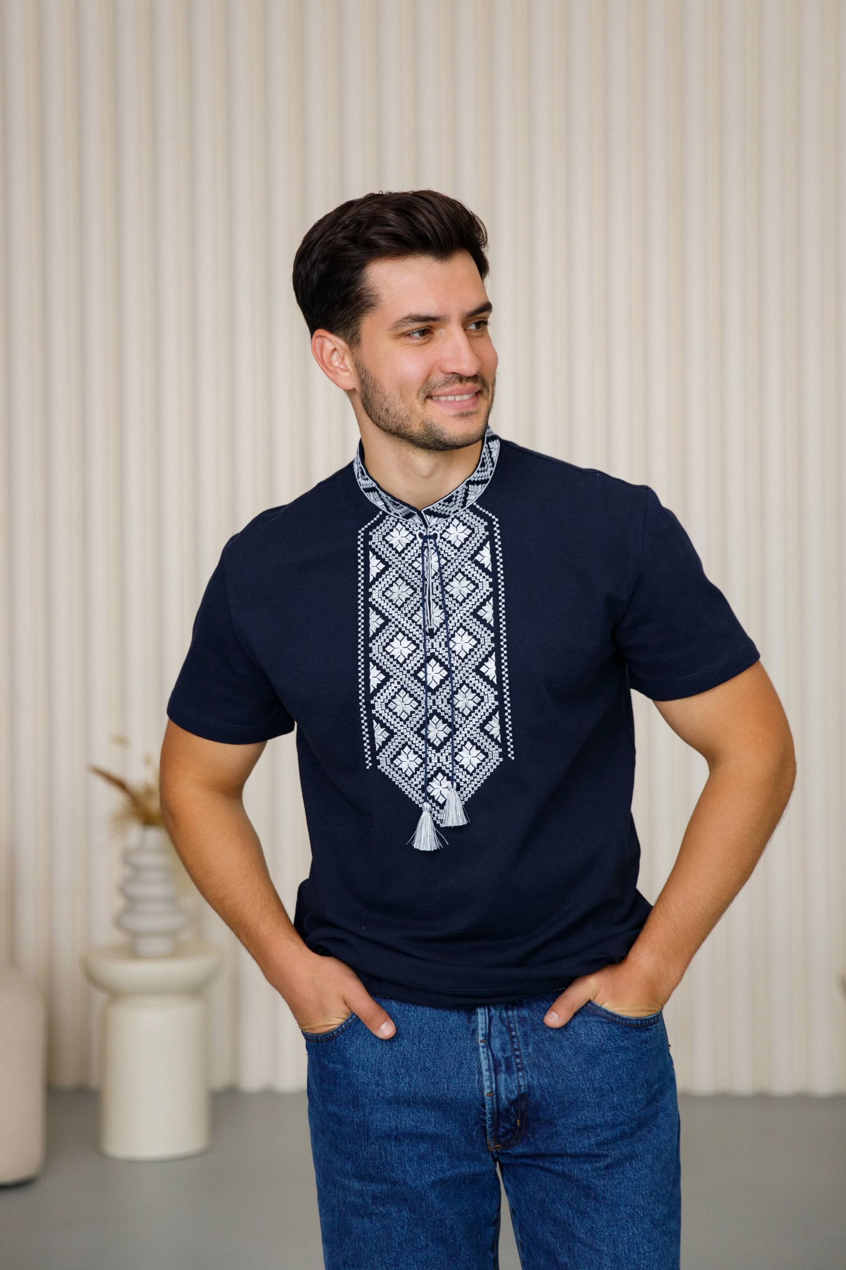 Чоловіча вишита футболка Спадщина ( темно-синя з сірим) виконана на трикотажі. Тип вишивки- хрестик.